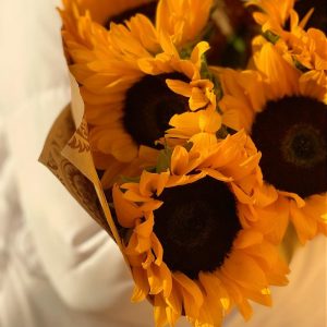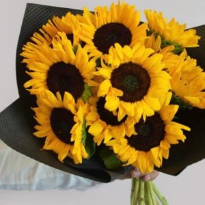 Букет из 15 подсолнухов в стильной упаковке “Пламенное солнце”