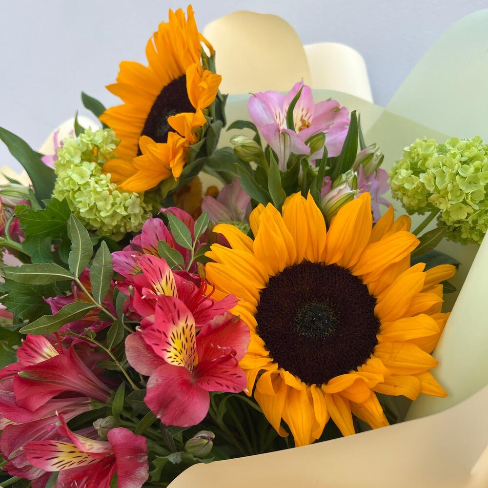 Букет «Sunny» (подсолнухи, альстромерии, калина) в Андреаполе